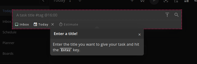 Add as many tasks as desired. There is a short-hand syntax available that is similar to many other task managers. Press 'Escape' or click outside the task overlay when done.
